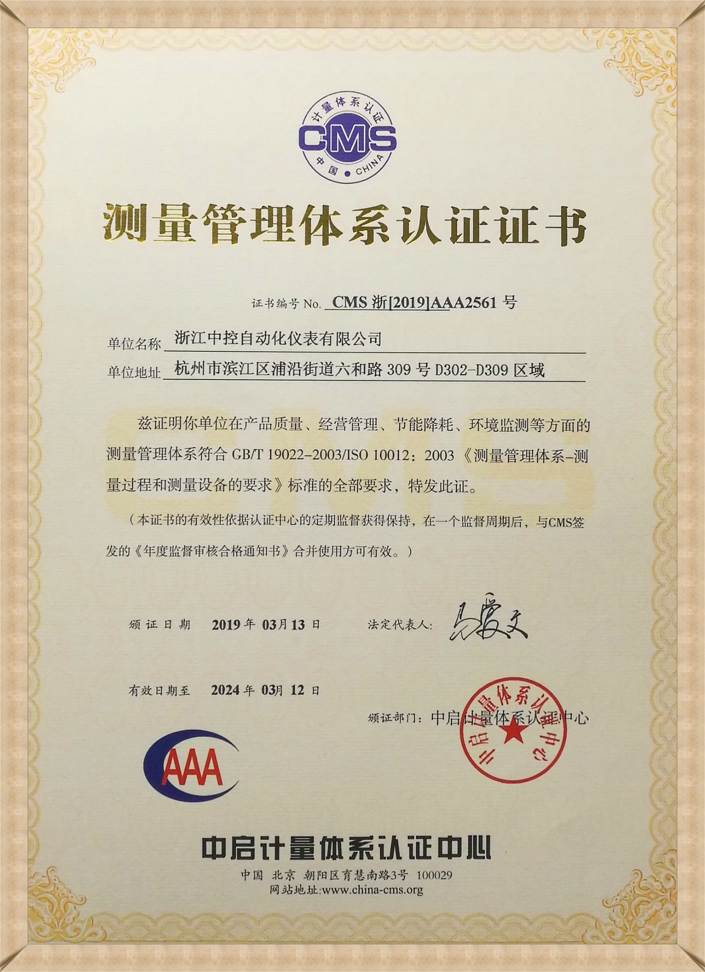 測(cè)量管理體系認(rèn)證證書